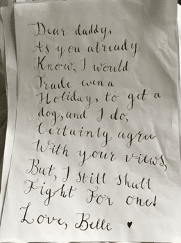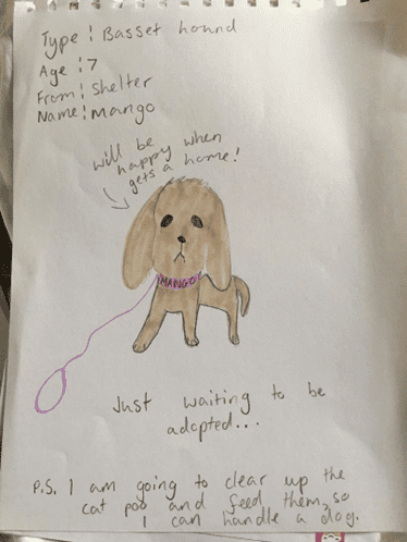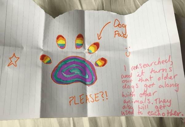 Letters about why we should get a dog…. cute drawings…. photos of dogs… even the free gift of a mini toy dog.