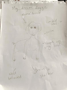 To start with, Belle has drawn her ‘dream doggie’ – one that I will like, which is calm and well-behaved.