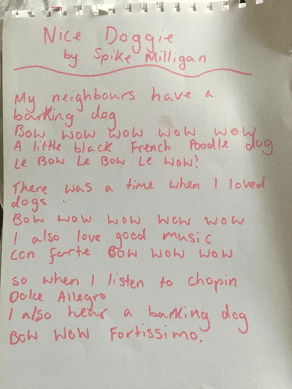 What Belle did was write out a poem called ‘Nice Doggie’ by Spike Milligan, a comedian I admire.