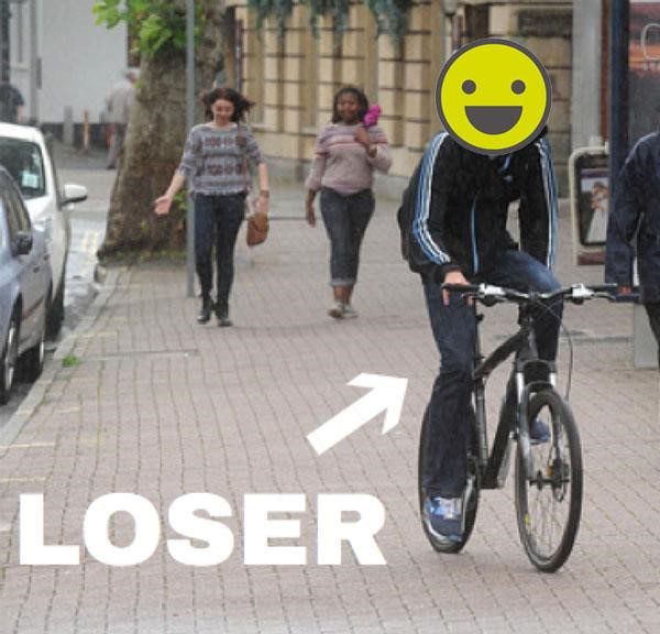 Thanks to wonderful town planning, pavements are almost always conveniently placed right next to – yep, you guessed it – roads…. you know, those long things made of tarmac that CYCLISTS ARE SUPPOSED TO RIDE ON…
